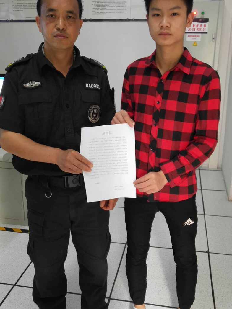 2、2019年5月8日上午11點08分,陽光一百南區(qū)中威戰(zhàn)士謝金云正在執(zhí)勤時,拾到一部蘋果手機,擔心失主著急,謝金云立即上報隊長并詢問R區(qū)廣場上的路人是否有人遺失了東西,正在謝金云詢問的過程中,他接到了失主程女士用其他手機撥過來的電話,謝金云這顆為失主焦慮不安的心才得以放下。謝金云告訴失主程女士讓她前往陽光一百南區(qū)客服中心領(lǐng)取手機,程女士連聲感謝。