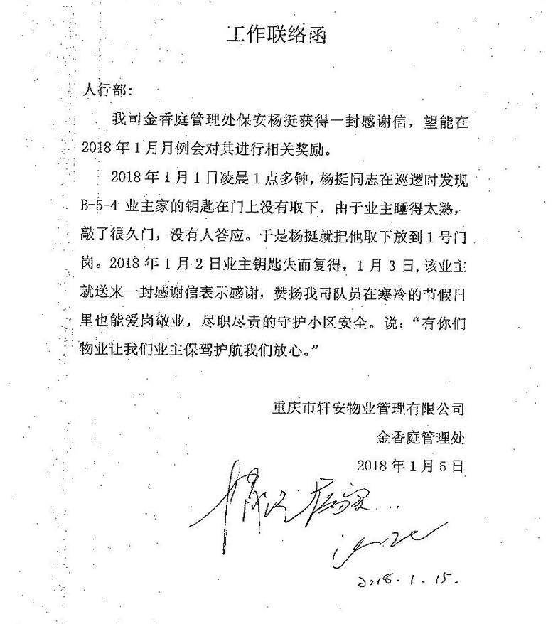 來自軒安物業(yè)的保安員楊挺認(rèn)真盡責(zé)的工作態(tài)度與全心全意為業(yè)主著想的品質(zhì)深深感動(dòng)了業(yè)主,他們?cè)诘谝粫r(shí)間送來感謝信,贊揚(yáng)中威戰(zhàn)士楊挺盡職盡職。